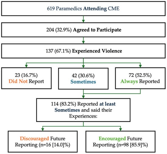 Recent investigations into violence against healthcare workers estimated that at least 60% of incidents of violence against physicians, nurses, and allied health providers go unreported [27,39]—a problem that extends to paramedicine as well. In a 2014 survey of paramedics from two Canadian provinces, Bigham and colleagues found that more than 75% of paramedics had been exposed to some form of violence—including verbal abuse, threats, sexual harassment, or physical or sexual assault—within the past year [38]. However, despite negatively affecting the participants’ job satisfaction and home life, only 40% indicated that they had reported the incidents to supervisors or police and less than 20% documented the encounters through formal incident reporting mechanisms [38]. Their findings have since been replicated in other studies that increasingly recognize violence against paramedics as a ‘serious public health problem’ but one that remains ‘vastly underreported’ [13].