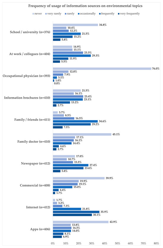 When asked how frequently information on environmental topics was gathered from specified information sources respondents answered that they were most often obtained via the internet (“frequently”: 35.9% (n = 148); “very frequently”: 30.1% (n = 124)), from family or friends (“frequently”: 29.2% (n = 120); “very frequently”: 7.5% (n = 31)), the newspaper (“frequently”: 23.6% (n = 97); “very frequently”: 5.8% (n = 24)) and from their school or university (“frequently”: 15,2% (n = 57); “very frequently”: 5.8% (n = 22)). Information sources that were generally used “very rarely” or even “never” were the occupational physician (“very rarely”: 12,0% (n = 47); “never”: 76.0% (n = 299)) followed by the family doctor (“very rarely”: 17.1% (n = 70); “never”: 45.1% (n = 185)), TV commercials (“very rarely”: 12.0% (n = 81); “never”: 76.0% (n = 163)), and apps (“very rarely”: 13.8% (n = 56); “never”: 42.9% (n = 174)) (see Figure 2).