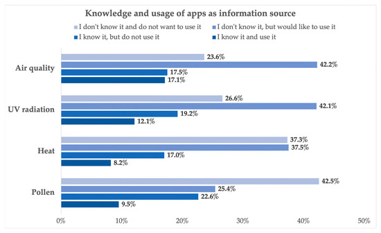 As we wanted to know more precisely whether our subjects used specific apps relating to air quality, UV radiation, heat, and pollen, we asked the question “Do you know and use apps relating to the environmental impacts listed?”. For each environmental impact, the following answers were possible: “I know it and use it”, “I know it, but do not use it”, “I don’t know it but would like to use it”, and “I don’t know it and do not want to use it”.