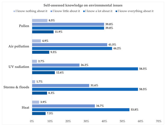 When asked about their self-assessed knowledge with respect to heat, storms and floods, UV, air pollution, and pollen, most respondents answered that they know a lot about it (heat: 53.8% (n = 222); storms and floods: 58.5% (n = 241); UV: 58.5% (n = 241); air pollution: 44.2% (n = 182); pollen: 39.8% (n = 164)) followed by those who reported to know little about it (heat: 34.7% (n = 143); storms and floods: 31.6% (n = 130); UV radiation: 26.2% (n = 108); air pollution: 41.5% (n = 171); pollen: 39.8% (n = 164)). The statements “I know everything about it” and “I know nothing about it” were only mentioned by a small proportion of the respondents (see Figure 4).