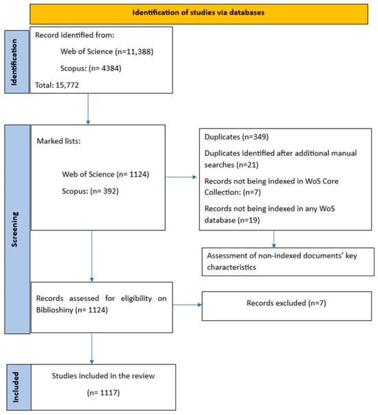 Documents that matched the inclusion and exclusion criteria were marked on the researcher’s WoS and Scopus accounts (Figure 1). A total of 11,388 documents were identified in the WoS and 4384 in Scopus, published between 2004 and 2023. Based on the study inclusion and exclusion criteria, 392 eligible documents were identified in Scopus and, initially, about more than 900 documents were identified at the WoS Core Collection. Subsequently, manual searches were conducted at WoS to retrieve the documents already identified on Scopus. In the WoS Core library, 89% Scopus documents (n = 349) were identified. Twenty-one additional duplicate entries were identified following manual searches using the document’s title or author’s name (previously retrieved by Scopus). On certain occasions (n = 7), documents were identified after searches to all the databases in the WoS, and nineteen documents were not indexed at the WoS databases at all. Finally, 1131 documents were generally identified through the WoS, of which 1124 belonged to the WoS Core Collection and were downloaded for further analysis.