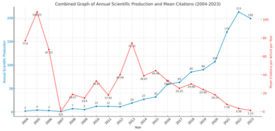 The final dataset used for this study was downloaded directly from the WoS in .txt format. Two independent researchers performed the data analysis, subsequently engaging in iterative discussions to reconcile discrepancies and achieve consensus on the findings. This collaborative approach ensured a reliable and accurate representation of the data. The analysis was conducted using Biblioshiny 4.1, available within the Bibliometrix package in RStudio 1 [27]. This open-source software provides a suite of statistical tools and functions for bibliometric analysis. It facilitates detailed productivity analysis, including publication and citation rates, as well as identifying key contributors to the field. Its tools can give an assessment of the h-index, m-index, and g-index, which are bibliometric indicators used to evaluate a researcher’s publication impact and productivity. The h-index reflects the number of publications (h) with at least h citations each, balancing productivity with citation impact. The m-index, calculated by dividing the h-index by the number of years since the first publication, adjusts for career length, offering insight into sustained impact. The g-index addresses the h-index’s limitation by emphasising highly cited papers, defined as the largest number (g) where the top g articles have collectively received at least g2 citations. Interpretation of these indices varies across disciplines, with low, moderate, and high benchmarks generally considered as follows: an h-index of 0–10, 10–20, and 20+, respectively; an m-index below 1, between 1–2, and above 2; and a g-index that closely follows, significantly exceeds, or doubles the h-index for low, moderate, and high categories.