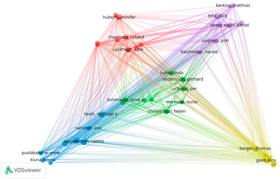 Figure 3 shows the bibliographical coupling of authors with more than five documents and more than five citations within our sample. This refers to the intellectual similarity between authors as manifested by their citations in other documents. The red cluster consists of nine authors whose work is mostly associated with digitally delivered mindfulness interventions. The green cluster also includes nine authors with outputs focusing on digital mental health interventions, often based on cognitive behavioural therapy. The blue cluster of authors includes eight authors with outputs focusing on interventions based on acceptance and commitment therapy. The yellow cluster includes seven authors whose work focuses on web-based interventions, often for depression and stress reduction. Finally, the purple cluster includes seven authors whose work focuses on digitally delivered interventions for mental health prevention and treatment.