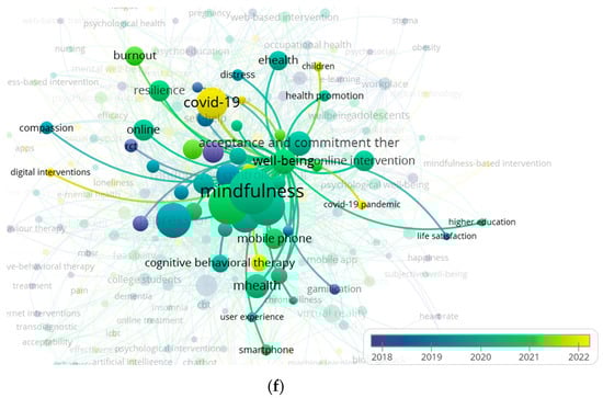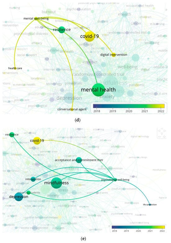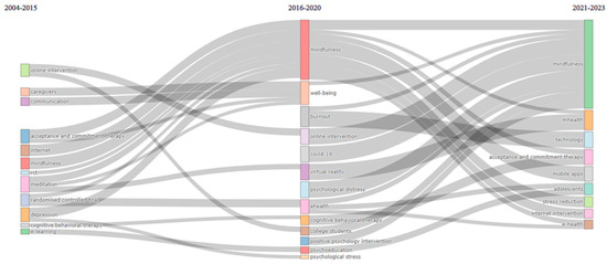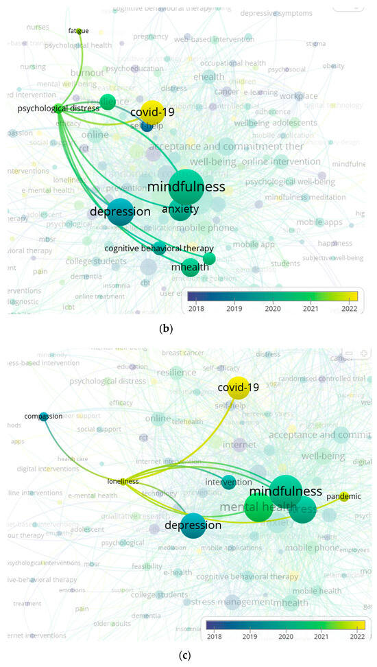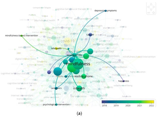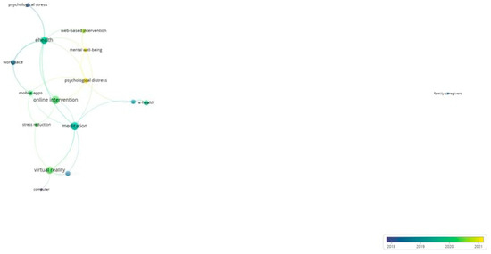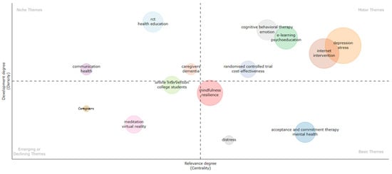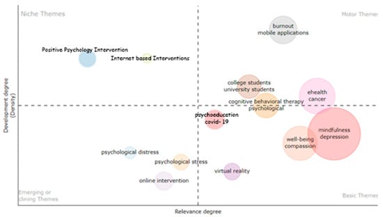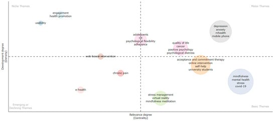 The themes of mindfulness, mental health, stress, and COVID-19 have the highest level of density in the sample, which means that they consistently co-occurred as keywords in other documents. However, they still lack development as they are low in centrality, which means that they exhibit little relationship with other clusters of themes within the thematic network. A cluster whose content appears to be closer to becoming a motor theme involves research focused on acceptance and commitment therapy, online intervention, self-help, and university students. Finally, the lowest in centrality but with overall good degree of density was the cluster of themes focusing on stress management, virtual reality, and mindfulness meditation.