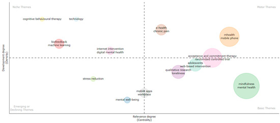 Two clusters of themes are shown to be pertinent to the research development of the field. The most well-developed one involves research in depression, anxiety, and mhealth, followed by a smaller cluster of themes focusing on quality of life, cancer, positive psychology, and psychological distress. Finally, the research cluster with a focus on adolescents, randomised controlled trial designs, psychological flexibility, and adherence placed them near the centre of the two axes, standing right between niche and motor themes.