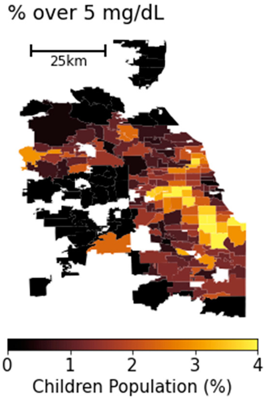 - Oyana, T.J.; Margai, F.M. Spatial patterns and health disparities in pediatric lead exposure in Chicago: Characteristics and profiles of high-risk neighborhoods. Prof. Geogr. 2010, 62, 46–65. [Google Scholar] [CrossRef]