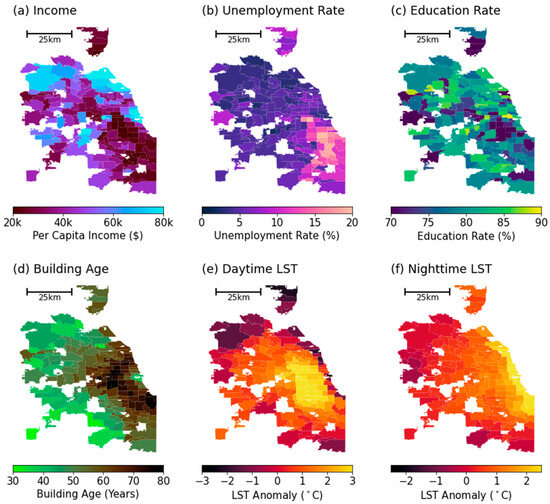 Zip-code-level map of socioeconomic variables and land surface temperature metrics. (a) Average per capita income (income), (b) unemployment rate (unemployment), (c) percentage of population with a high school diploma (education), (d) years after the building was built (building age), (e) average daytime (10:00~15:00) LST anomaly for summertime (June, July, and August) from 2018 to 2021, and (f) average nighttime (00:00~05:00) LST anomaly for summertime from 2018 to 2021.