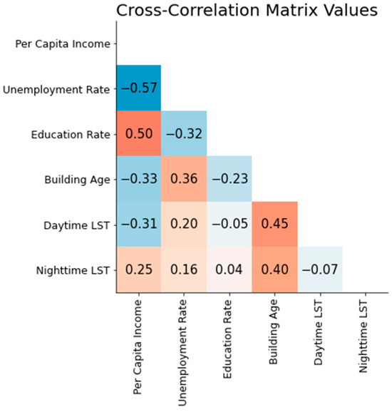 Assessing the interrelationships among predictor variables is a critical step in ensuring the robustness of our analysis. Figure 3 illustrates the cross-correlation matrix for the predictor variables, providing insights into the potential multicollinearity that could affect the interpretation of the results. The cross-correlation analysis indicates that the highest correlation exists between the unemployment rate and per capita income, with a coefficient of −0.57. While this is substantial, it does not preclude the inclusion of both variables in our model, as the inclusion of both enhances our model’s performance.