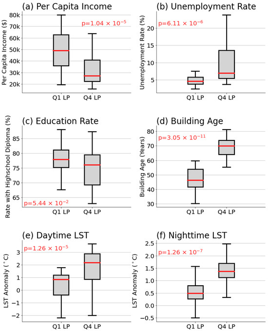 As depicted in Figure 4, per capita income appears to have a negative impact on LP rates (Figure 4a), suggesting that zip codes with higher LP rates tend to exhibit lower income levels. In contrast, the unemployment rate (Figure 4b) and building age (Figure 4d) have a positive impact, indicating that zip codes with higher LP rates are associated with higher unemployment rates and older buildings. Furthermore, both daytime and nighttime LST demonstrate a positive impact (Figure 4e,f), implying that regions with higher LP rates are likely to experience higher surface temperatures. It is notable that the education rate does not exhibit a significant discrepancy between the Q1 and Q4 groups, with a p-value of 0.054, which is above the conventional threshold (0.05) for statistical significance.