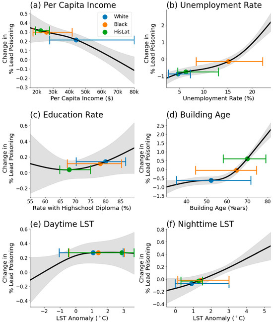 Partial dependence of each predictor variable, derived from GAM regression. The variables include (a) per capita income, (b) unemployment rate, (c) education rate, (d) building age, (e) daytime LST, and (f) nighttime LST. The black line represents the estimated partial dependence, while the gray shaded area shows the 90% confidence interval of the dependence. Blue, orange, and green dots represent the median values for each racial group, while the corresponding error bars denote the 5–95th percentile interval of predictor variables, for each racial group.