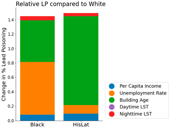Bar graph showing the relative change in LP rates for Black and Hispanic/Latino (HisLat) populations in comparison to the White population. Each bar is segmented to demonstrate the contribution of different predictor variables: per capita income (blue), unemployment rate (orange), building age (green), daytime LST (purple), and nighttime LST (red).