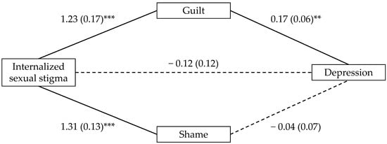 Indirect effects of internalized sexual stigma on depression. Notes. Values represent B (SE). *** p < 0.001, and ** p < 0.01. Solid lines reflect statistically significant paths; Dashed lines did not reach statistical significance.
