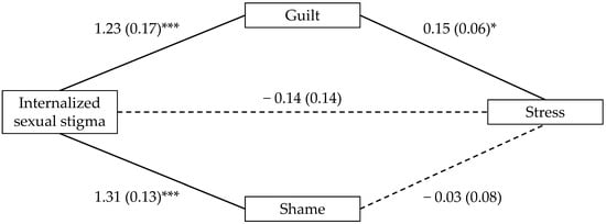 Indirect effects of internalized sexual stigma on stress. Notes. Values represent B (SE). *** p < 0.001, and * p < 0.05. Solid lines reflect statistically significant paths; Dashed lines did not reach statistical significance.