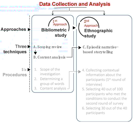 This study employed two qualitative approaches to gather comprehensive and descriptive data: a bibliometric study [67,68,69] and an ethnographic study [70]. The first approach of our bibliometric study consists of two consecutive techniques. We conducted a scoping review and content analysis using the first and second techniques. These techniques were used to identify commonalities, key differences, strengths (facilities), weaknesses (barriers), and planning and design factors for both types. These two techniques included three procedures as described. The first procedure of the first approach determined the scope of the investigation, with a focus on environmental and social sciences as the subject areas. It includes three categories: public health, medicine, psychology, nature landscape planning, geography, planning, development, urban studies, and transportation. Table 1 considered subject categories, the h-index, and the best quartile (Q1, 2, and 3) for 26 journals.