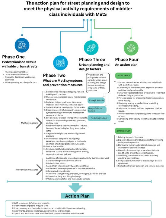 A conceptual framework that urban planners and designers can utilize to ensure that streets are designed to suit the requirements of reducing MetS risks. To achieve this aim, the study sets three objectives. Revisits planning and design of two types of urban streets: “pedestrianized” or “walkable” to encourage walking as a physical activity. The study also examines which form of urban street is most conducive to physical activity and can help mitigate MetS risks: pedestrianized or walkable.