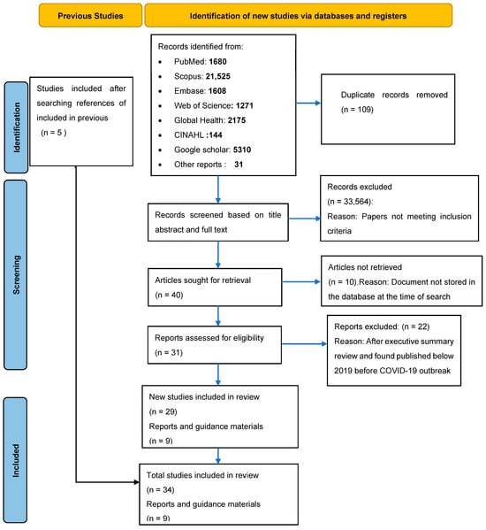 A total of 33,744 documents were initially retrieved through PubMed, 1680 (5% of 33,744); Scopus, 21,525 (63.8%); Embase, 1608 (4.8%); Google Scholar, 5310 (15.7%); Web of Science 1271 (3.8%); Global Health 2175 (6.4%); CINAHL 144 (0.4%); and national and international publications and the gray literature, 31 (0.1%). After completing level 1 and level 2 screening, the review analyzed 43 documents including 34 research papers and nine reports and guidelines published by the WHO and the United States Centers for Disease Control and Prevention (CDC) (Figure 1). Twenty articles were observational studies and 14 were prediction models. Most of the observational studies focused on airport screening practices, three reported on ground crossing and one paper described screening at a sea port. The results of this review are presented in various sections including the screening strategies used; effectiveness of POE screening in detection, delay and reduction in international transmission; effectiveness of temperature and symptom screening to detect COVID-19 among travelers at POEs; comparison between POE screening and other public health measures in detection and containment of COVID-19; and published recommendations from international organizations on how screening for COVID-19 should be carried out.