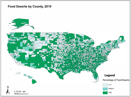 Food desert data were retrieved from the USDA Food Access Research Atlas (2019), which provides a spatial overview of low-income and low-access (LILA) census tract-level food access data. Included in these data is a tract-level indicator designating both LILA areas: low-income tracts where the populace of at least 500 people and/or at least one-third of the census tract live beyond a specified distance to a grocery store (>1 mile for urban communities; >10 miles for rural communities) [27]. A census tract is designated as low-income if it has a poverty rate of at least 20% or a median family income at or below 80 percent of the metropolitan area or state median income level [27]. Additional LILA tract-level indicators of food access were also examined: half mile (urban) and 10 miles (rural), 1 mile (urban) and 20 miles (rural). We counted the number and percentage for each LILA tract-indicator within each US county and operationalized county-level food desert variables to identify counties by the prevalence of LILA tracts within them (low: 0–33.4%; mid-range: 33.5–66.6%; and high: 66.7–100.0%). The food access indicator variables were linked to birth records by a geographic identifier for the maternal county of residence (Federal Information Processing System codes).