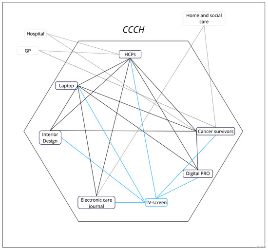 The hexagon in Figure 1 describes the interactions in the network at the CCCH. The cancer survivors are in the network as they are responsible for completing the PRO questionnaire and participating in their rehabilitation. The HCPs are responsible for the initial consultations at the CCCH and the cancer survivor’s rehabilitation. The digital PRO questionnaire is a form used in the consultation to obtain a snapshot of the cancer survivor’s health status (physical and mental health). A laptop is used in the HCPs’ workflow to access the answered PRO forms or the electronic care journal. The interior design represents how the consultation rooms are furnished and highlights possible challenges when working digitally. The TV screen was identified in part II and is therefore connected with blue lines. It is a wall-mounted TV screen located in the consultation room and is used by the HCPs to show information to the cancer survivor. The network is also related to external actors who are not directly involved in the rehabilitation at the CCCH. The hospital and the patient’s general practitioner are external actors as they provide the cancer survivor with medical treatment in parallel with their rehabilitation at the CCCH. The home and social care are users of the same electronic care record as the CCCH and are therefore included as external actors. These actors are connected via dotted lines to the network at the CCCH. The electronic care journal is a documentation system used in the municipality, where the HCPs in the CCCH have access to the cancer survivor’s data.