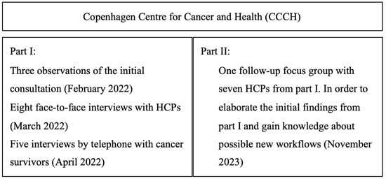 The study is a qualitative study consisting of two parts (Figure 1): part I involved observations to understand the context and develop interview guides, followed by interviews with HCPs and cancer survivors. Part II consisted of a follow-up group interview based on the findings from the initial interview with HCPs and cancer survivors to gain knowledge about possible changes in the HCPs’ workflows since May 2022. As the context had become more digital in its workflows and a new digital actor had been introduced since part I, the group interview could also provide information about how new digital tools impacted the workflows in a given context and vice versa. This adds an additional dimension to ANT.