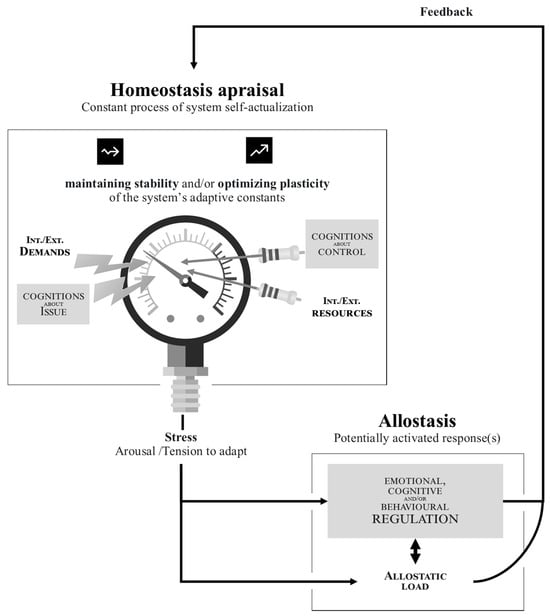 In physiology, stress is an alarm signal (i.e., tension) that prepares the organism for self-defense and/or expansion [,]. Stress triggers allostasis, which allows homeostasis to be restored. The stress remains adaptive, as long as the level of arousal remains well tolerated by the system, and a change is promptly provided to terminate the signal (see allostatic load below). The nomological network of stress includes constructs such as physiological reactions (i.e., hunger, thirst, fatigue, and excitement), emotions (i.e., fear, sadness, disgust, anger, surprise, joy, and boredom), and normative discomforts (i.e., cognitive dissonance and guilt) [,,]. The forms of stress are specific to a given homeostatic imbalance, informing and guiding the system to achieve balance. It broadly represents the idea of ‘drive’, ‘need for regulation’, and even ‘motivation’, which could manifest in different ways depending on whether it is referring to an individual or a larger entity such as an organization system. For example, one might refer to an institution (hospital, school) that is in crisis, ‘under tension’, or ‘with needs in...’. It is also important to point out that arousal can differ in intensity as well as duration, which can affect allostatic activity (e.g., low levels of stress may not motivate, while excessive tension may paralyze) [,,,]. Signals can occur concurrently, but the ones activated last gradually erase/scramble the older signals. Individuals differ subjectively when it comes to their susceptibility to stress, and there is also the phenomenon of stress desensitization as well [,,,]. Due to the feedback-loop process, stress itself can confer internal pressure and, when conditions and resources allow for it, may also be cognitively appraised and elaborated/rebuilt (see further).