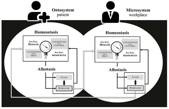 Illustration of the inter-influence in the adaptation of two systems in the DEA-A model. Notes: According to the figure, a patient’s self-regulation (e.g., extending sick leave) can influence the specific homeostasis of the workplace microsystem (e.g., threatening to fail to meet deadlines and tarnishing the company’s image), even a specific actor’s balance within it (for instance, the repercussions of an employee’s sick leave on the subsequent mental load and physical fatigue of colleagues). In turn, these impacted entities are likely to produce allostatic responses that may modify their internal and external environments, leading ultimately to a direct or indirect effect on the patient (e.g., implicit pressure to return to work, exclusion, or displacement).