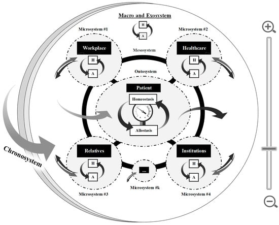 By emphasizing ecosystem, we first and foremost acknowledge that each system, and the actors within it, regulate their own adaptation needs without attempting to ensure that other systems are kept in equilibrium [Note. The case of whistleblowers is quite illustrative. Employees who become aware of institutional mistreatment or food contamination with E. coli bacteria may alert the institution’s hierarchy (institutionalized allostatic response), which will then configure a stress signal for the organization. In response, the institution could self-regulate through emotional (e.g., disregarding alerts), cognitive (e.g., minimizing the situation), and/or behavioral (e.g., establishing new directives) allostatic responses. There is, then, a possibility that it may recover its own equilibrium, without necessarily and sustainably resolving the issue. This situation can lead to employees collectively stopping the activity (going on strike) or alerting the public to seek allostasis from an overall system (e.g., the state, the justice system). Whistleblowers may, therefore, result in additional stress for the institution, which could result in their actions being criticized or made detrimental for them. It is, therefore, the most shared functioning of employees to maintain the activities under threat of losing their jobs and jeopardizing their individual personal/family balance. As a result, they become inclined to more cognitive (e.g., dilution of responsibility, external justifications) and emotional means of regulation (e.g., sensitization, an increase in tolerance thresholds). Even though socially understandable or even acceptable, this instinctive register of adaptation adversely impacts other A/Os, such as families who may face loss or vulnerability. As a result of this lack of symbiosis in the adaptation of an A/O, whistleblower protection measures are employed to ensure that the ecosystem operates properly]. By extension, the same regulation (e.g., adoption of telecommuting) could be adopted by two systems, but serve different adaptive purposes (e.g., competence for the company: ‘maintaining activity’ vs. relatedness for the employee: ‘more time with the family’). It is, however, important to seek a functional adaptation between systems (or symbiosis) at the risk of an escalation of regulation and that chronic homeostatic imbalances may eventually disrupt the balance of the surrounding systems or the entire ecosystem (i.e., butterfly effect). Since environmental resources (e.g., social support for patients) are internal resources for others (e.g., time, attention, and emotional investment for caregivers), their exploitation can alter the balance within both systems (e.g., increased patient quality of life versus burden for caregiver, thereby deteriorating the relationship). In this way, the allostatic load paradigm should be extended from the intrasystem level of the A/Os to the relational dynamics between them (e.g., resistance as a degradation of communication, relationship, or therapeutic alliance between two stakeholders), up to the entire ecosystem (e.g., decline/erosion of resources until rupture occurs). In Figure 3, the double arrows illustrate this porosity of systems and their imprint on the environment, i.e., between what each consumes as resources and produces as a result of its own adaptation (new requirements, constraints, and/or resources). The developments are reflected in the chronosystem. It should be noted that temporality is not necessarily objective or quantifiable and that each system evolves at its own pace.