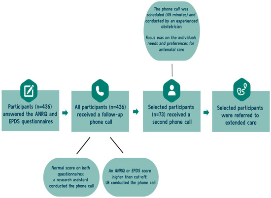 All women who completed the questionnaire were subsequently contacted by phone by LB or a research assistant (Figure 1). If the initial phone consultation revealed a need or a potential need for extended care, a second follow-up phone consultation with an experienced healthcare professional from the hospital visiting team was arranged. For this follow-up consultation, 45 min was allocated. During this consultation, the following antenatal care program was tailored taking the concept of shared decision-making (SDM) [32] into account, including the women’s individual needs and preferences.