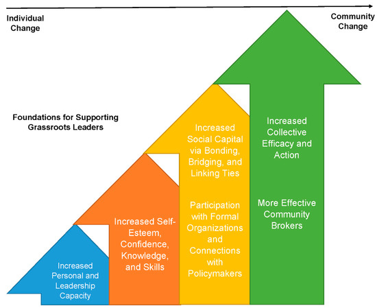 The purpose of this research was to assess leadership growth (i.e., changes in personal capacity and social capital) among women living in high-risk infant mortality zip codes who completed a grassroots maternal and childhood health leadership (GMCHL) training program. We used semi-structured qualitative interviews and thematic analysis. Three major themes associated with the training program experience were identified: (1) building personal capacity and becoming community brokers; (2) linking and leveraging through formal organizations; and (3) how individual change becomes community change. Although many of the grassroots leaders were already brokers (i.e., connecting individuals to information/services), they were able to become community brokers by gaining new skills and knowledge about strategies to reduce adverse birth outcomes in their community. In particular, joining and participation in formal organizations aimed at improving community health led to the development of linking or vertical ties (e.g., “people in high places”). The grassroots leaders gained access to people in power, such as policymakers, which enabled leaders to access more resources and opportunities for themselves and their social networks. We outline the building blocks for supporting potential grassroots leaders by enhancing personal capacity and social capital, thus leading to increases in collective efficacy and collective action.