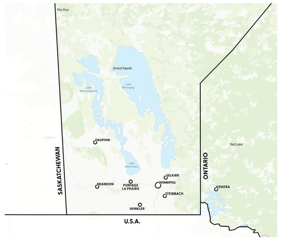 Ammann-Lanthier’s (2023) research undertook a qualitative single case study of young adults concerned with the environment and who were practitioners of alternative food practices, located in cities in the Southeastern Prairie Region in Canada (see Figure 1) []. The conceptual framework developed for this research drew upon climate distress literature in the disciplines of public health and psychology, and the field of food studies. The research was guided by a social constructivist worldview, recognized as appropriate to understand participants’ subjective experiences []. A qualitative approach allowed for a focus on participants’ experiences in their own words and generated rich textual description of their experiences, enhanced by undertaking an exploratory case study of one location []. A two-tiered sampling approach was utilized by which the criteria were selected first and then the people within the case [].