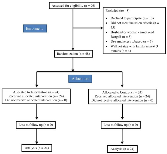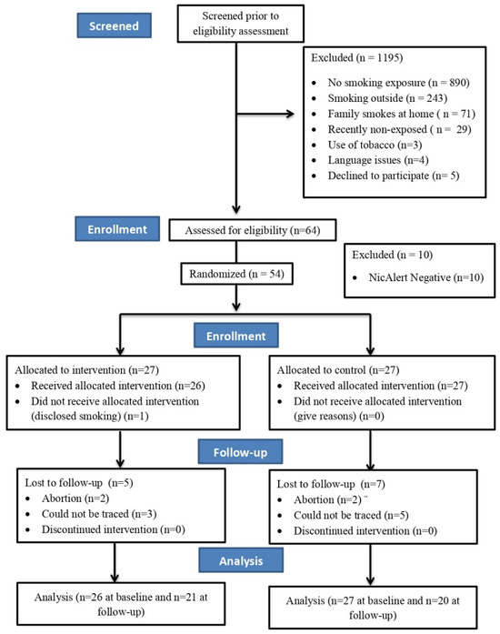 The first follow-up was three months after the intervention. The second follow-up was 24–48 h after delivery, when the birth outcomes were recorded. Saliva cotinine was the primary biological outcome indicating the level of SHS exposure and was collected at the baseline and at the three-month follow-up. To overcome the limitations of previous studies [12], which relied on self-reported outcomes following interventions to reduce SHS exposure, we used salivary cotinine, an objective biological measure, as a primary outcome. The research staff collecting data on the outcomes were blind to the allocation. The participants were given a food packet and compensated for travel or lost wages during the follow-up assessment.