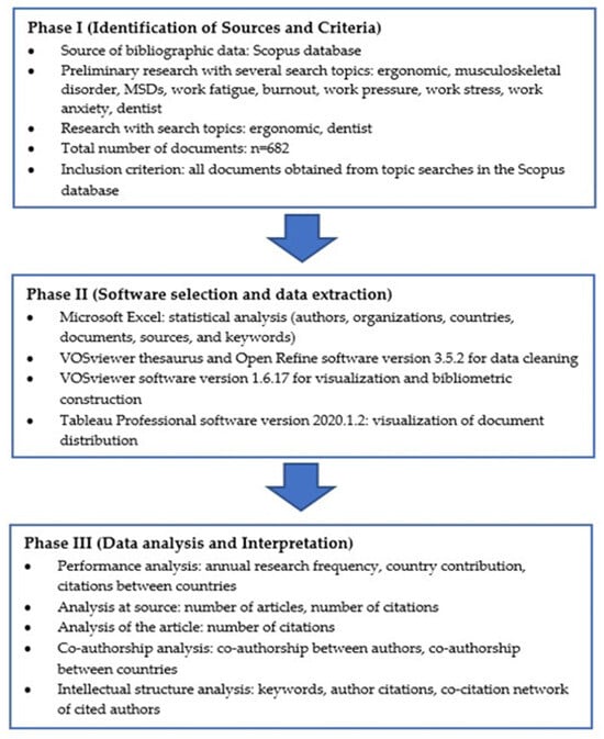 Based on the results of data mining with several topics in our preliminary research, the topics of ergonomics and dentistry were selected, which provided the largest number of documents. During this research, data mining was carried out on the Scopus database using Boolean expressions (ergonom* AND dentist*) on 14 April 2023. The search results were exported into a Comma-Separated Value (CSV) file in Microsoft Excel [34]. Microsoft Excel software was also used to analyze all information from recruited sources. To work on visualization and bibliometric construction, VOSviewer software version 1.6.17 was used, and to clean the data, Thesaurus_text in VOSviewer and Open Refine software version 3.5.2 were used.