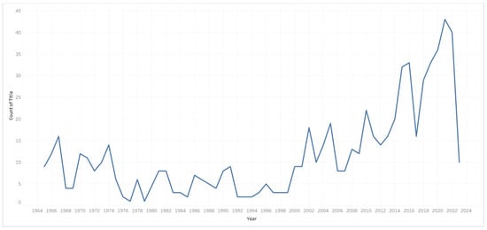 The trend of a count of titles for the year. The year and count of titles filter the view. The year ranges from 1965 to 2023. The count of the title filter ranges from 1 to 43.