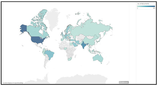 A bibliometric coupling analysis was used to evaluate the number of articles published based on the authors’ country of origin (Figure 3). There were 90 countries with at least one article and zero citations. The United States occupied the highest position for ergonomic dentistry publications with 89 articles. The ranking of countries based on the number of articles can be seen in Table 2.