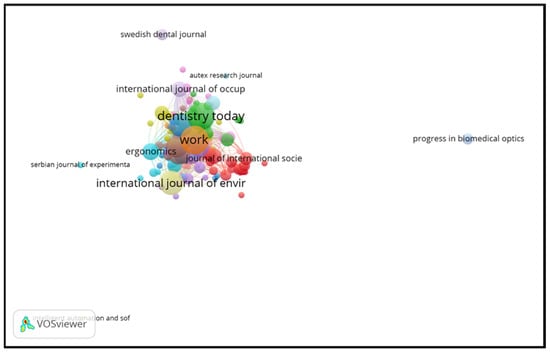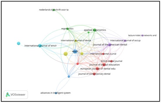 This citation analysis used VOSviewer in the sources unit, with a minimum threshold of having one document and zero citations. The aim of providing zero citations is that all sources can be presented through this application (Figure 5). As a result of taking this approach, 323 sources indexed by Scopus were recruited, and the largest collection of connected sources consisted of 162 sources. Table 5 shows the results of an analysis of sources based on citations, where the Journal of The American Dental Association is the top source with a citation weight of 460, followed by BMC Musculoskeletal Disorders (421 citations), Work (338 citations), and Applied Ergonomics (262 citations).