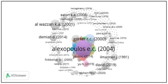 Network visualization in the analysis of the most frequently cited documents. There are two groups, namely, the first group includes colorful circles, dominated by Alexopoulos E.C. (2004) with the largest circle, and the second group includes transparent gray circles, dominated by Al Wazzan K.A. (2001) with the largest circle. This coloring difference indicates no relationship between the first and second groups. Regarding circle size, the higher the citation weight, the bigger the circle [35].