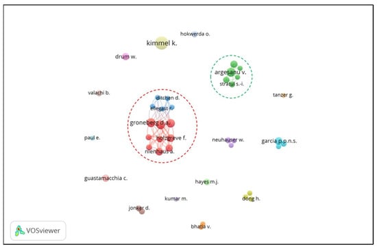 Co-authorship network visualization: in the red circle is the combined co-authorship of Clusters 1 and 3; meanwhile, in the green circle, the co-authorship of Cluster 2 is shown.