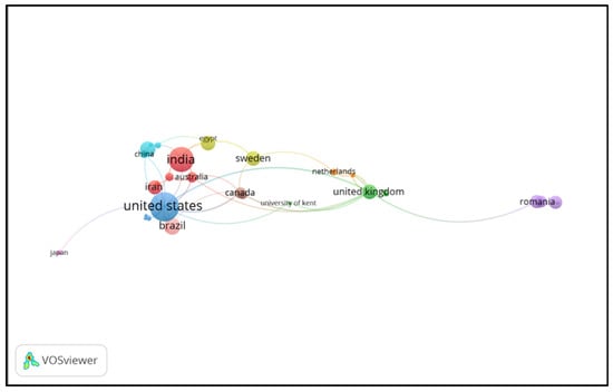 Co-authorship analysis was carried out on country analysis units with a maximum limit of 25 countries in one article and a minimum of one article per country, with a zero-citation limit. We found that 90 countries met these limits, and the most extensive set comprised 35 connected countries (Figure 8). In Table 7, the ten countries with the top co-authorship are presented.