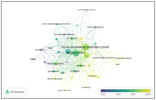 The aim of analyzing the authors’ keywords is to find the correlation between keywords and the articles’ topics, in this case, so that readers will find it easy to search for various dimensions of research on the themes of ‘ergonomics’ and ‘dentistry’. The analysis was performed using the VOSviewer application, namely, a co-occurrence analysis of the authors’ keywords with a minimum threshold of five keyword occurrences. There were 758 keywords detected, and 34 met the threshold specified above.