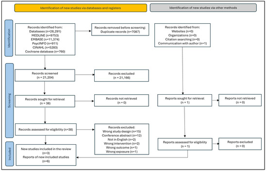 The two repeat searches identified an additional 4070 and 5922 citations, respectively. Six reports from three discrete observational studies met our inclusion criteria. Five reports (three peer-reviewed manuscripts and two doctoral theses) were identified from the database search [21,22,23,24,25]. We obtained one additional manuscript through correspondence with the study author [26]. None of the studies had been retracted or corrected as of 12 March 2024.