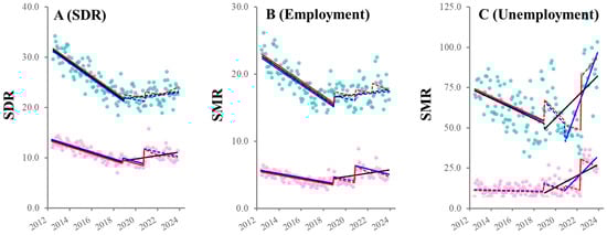 Fluctuation of SDRs and SMRs of employed and unemployed individuals from January 2012 to June 2023 in Japan using ITSA. Panels (A–C) indicate the trends and discontinuity of SDRs and SMRs of employed and unemployed individuals, respectively. Ordinates indicate the SDR or SMR (per 100,000 population). Abscissas indicate the year. Blue and red circles indicate the observed annualized monthly SDRs and SMRs of males and females, respectively. Black lines indicate the results calculated by ITSA with interventions set during the period of the “Work Style Reform Act” alone. Blue lines indicate the results calculated by ITSA with interventions set during the period of enacting the “Work Style Reform Act” during the COVID-19 pandemic outbreak. Red lines indicate the results calculated by ITSA with interventions set during the period of enacting the “Work Style Reform Act”, the COVID-19 pandemic outbreak, and the “revision of economic supportive countermeasures against economic deterioration caused by COVID-19”. Solid and dotted lines indicate the significant and non-significant trends or discontinuities detected by ITSA, respectively.