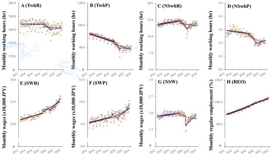 Fluctuation of labor indices in Japan from January 2009 to June 2023 using ITSA. Upper side panels (A–D) indicate the trends and discontinuity of total working hours of regular employees (TwhR: (A)) and part-time employees (TwhP: (B)), non-scheduled working hours (overtime working) of regular employees (NSwhR: C) and part-time employees (NSwhP: (D)), respectively. In the lower side panels, panels (E–G) indicate the trends and discontinuity of wages: fixed wage for scheduled working hours of regular employees (SWR) and part-time employees (SWP) and wage for non-scheduled working hours (NSW), respectively. Panel (H) indicates the trend and discontinuity of regular employment opportunities (REO). Ordinates indicate the monthly working hours (h) in panels (A–D), monthly wages (JPY × 10,000) in panels (E–G), and REO (%) in panel (H). Abscissas indicate the year. Circles indicate the observed values of monthly labor indices. Black lines indicate the results calculated by ITSA with interventions set during the period of enacting the “Work Style Reform Act” alone. Blue lines indicate the results calculated by ITSA with interventions set during the period of enacting the “Work Style Reform Act” during the COVID-19 pandemic outbreak. Red lines indicate the results calculated by ITSA with interventions set during the period of enacting the “Work Style Reform Act”, the COVID-19 pandemic outbreak, and “revision of economic supportive countermeasures against economic deterioration caused by COVID-19”. Solid and dotted lines indicate the significant and non-significant trends or discontinuities detected by ITSA, respectively.