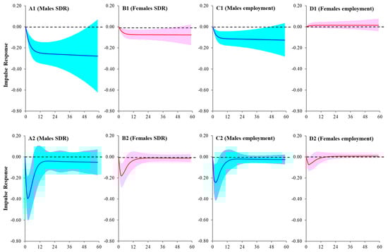 Impulse responses of SDRs and employed SMRs of males and females to increase one SD of REO using VAR. Impulse responses of males SDRs (A1,A2), males employed SMR (B1,B2), males employed SMR (C1,C2), and females employed SMR (D1,D2) to increase one SD of REO. Upper side panels (A1–D1) indicated the results using single-factor VAR (REO alone). Lower side panels (A2–D2) indicate the results using multiple-factor VAR (Twh, TwhR, TwhP, Swh, NSwhR, NSwhP, SW, SWR, SWP, NSW, and REO). Ordinates indicate the impulse response of SDR or SMR. Abscissas indicate the month after the impulse. The blue and red lines and regions indicate the mean ± 95% confidence interval (CI) of responses from males and females, respectively.