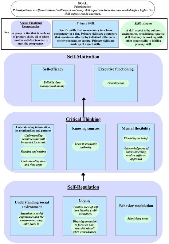 Figure 2 shows an example of how skills are learned and built into executive functioning, a primary skill of Self-Motivation. Some researchers propose that critical thinking is a component of executive functioning. However, in our framework, Critical Thinking is treated as a distinct social–emotional competency due to its unique social objectives compared to executive functioning as defined in the section titled “Self-Motivation” in this paper. Executive functioning aims to control, coordinate, and integrate tasks for efficient performance, whereas critical thinking focuses on making judgments and solving complex issues [