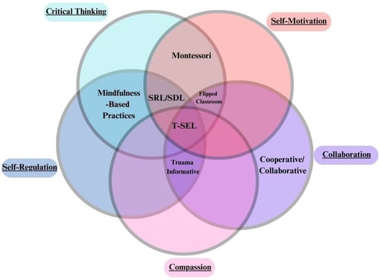 Figure 1. The social–emotional competencies are as follows: Self-Regulation, Critical Thinking, Self-Motivation, Compassion, and Collaboration. These terms are capitalized to distinguish the competency as a part of our proposed framework from the generalized or popular use of these terms, which will be represented in lowercase. Due to polysemy, it is necessary to discern between the two. Primary skills within this framework are necessary for social–emotional development and the fulfillment of a social–emotional competency. Primary skills define a competency and are universal across cultures, environments, and individuals. All primary skills within a social–emotional competency must be met with at least one (but ideally more) of a number of skill aspects (i.e., facets) which make up the primary skills. While at least one skill aspect is necessary to each primary skill, there is no specific skill aspect or combination of specific skill aspects that are required to be competent in a primary skill. This is because skill aspects fluctuate based on environment, culture, or an individual’s needs. For instance, the two primary skills,