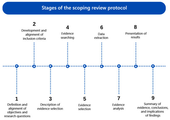 This scoping review protocol was designed following the JBI manual and the theoretical framework proposed by Arskey and O’Malley [23], updated by Levac, Colquhoun, and O’Brien [24] and Peters et al. [25]. In addition, the Preferred Reporting Items for Systematic Reviews and Meta-Analyses Extension for Scoping Reviews (PRISMA-ScR) guided its development [26]. The protocol was developed and registered on OSF and can be accessed through the following link: http://doi.org/10.17605/OSF.IO/6JK5Z (accessed on 16 January 2024).