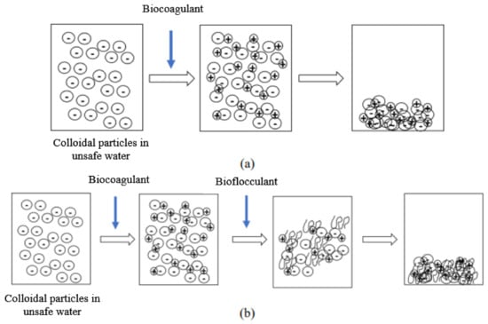 Mechanism of action of the biocogulant during the coagulation–flocculation process (a). Mechanism of action of the biocogulant/bioflocculant complex during the coagulation–flocculation process (b).
