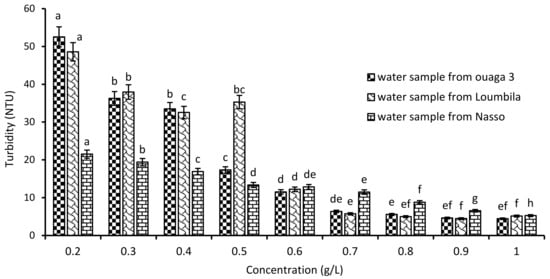 Variation of turbidity of water samples as a function of Moringa Oleifera seeds’ extract concentration. The letters “a, b, c, d, e, f, g, h” indicate the different variations. Sticks with the same letters have statistically not different values. However, sticks with different letters have statistically different values.
