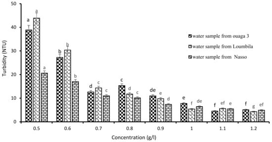 Variation of turbidity of water samples as a function of Boscia senegalensis seeds extract concentration. The letters “a, b, c, d, e, f, g” indicate the different variations. Sticks with the same letters have statistically not different values. However, sticks with different letters have statistically different values.