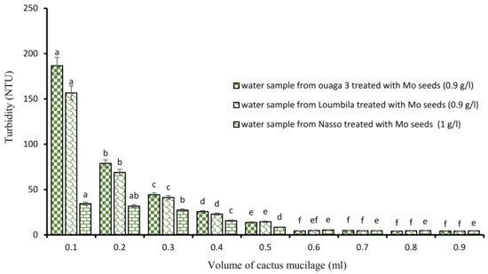 Turbidity variation depending on the volume of cactus mucilage added in Moringa seeds-based treatment. The letters “a, b, c, d, e, f” indicate the different variations. Sticks with the same letters have statistically not different values. However, sticks with different letters have statistically different values.