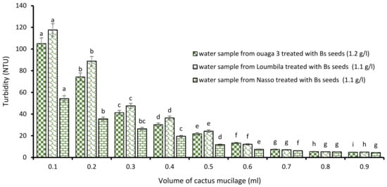 Turbidity variation depending on the volume of cactus mucilage added in Boscia seeds-based treatment. The letters “a, b, c, d, e, f, g, h, i” indicate the different variations. Sticks with the same letters have statistically not different values. However, sticks with different letters have statistically different values.